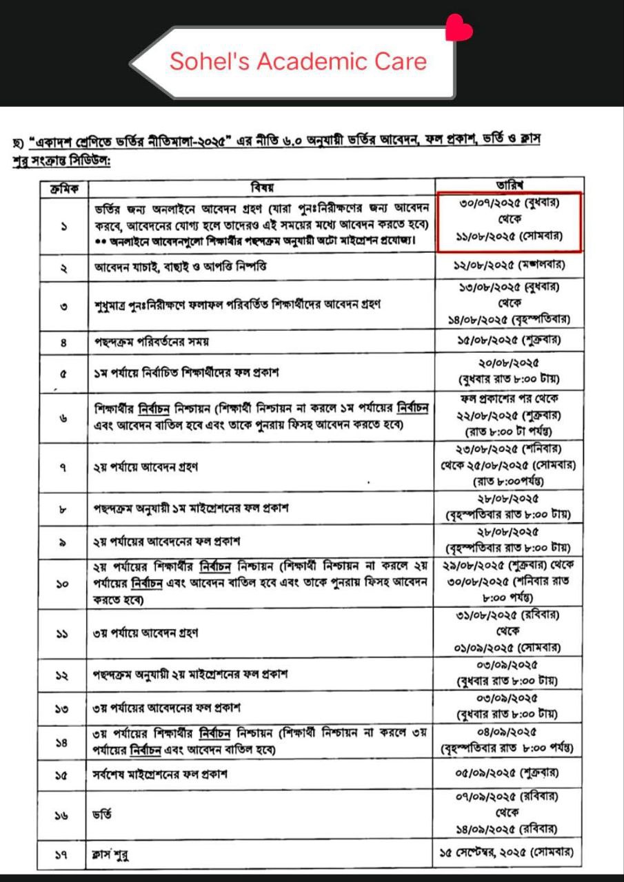 | ভর্তির শ্রেণি | একাদশ শ্রেণির ভর্তি বিজ্ঞপ্তি ২০২৫, কলেজ ভর্তি আবেদন ২০২৫ |