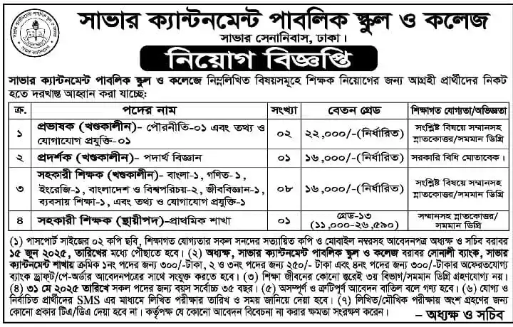 By the grace of the Almighty God, all the branches are progressing day by day in full swing. JSC, SSC & HSC courses have successfully been affiliated with the Board of Intermediate and Secondary Education, If you want to apply for this job, you should submit your application within a specific time. Cantonment Public School & college job circular 2025 has been converted to an image file so that everyone can read it easily or download this job circular. Cantonment public school & college job circular 2025 has been given below.