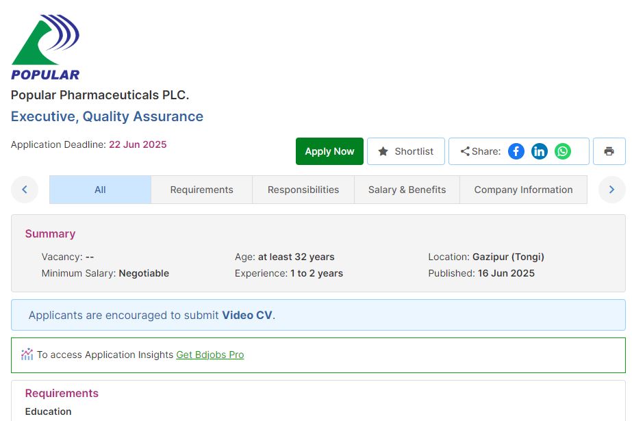 Popular pharmaceuticals ltd. job circular 2025 has been published. It’s the most popular job circular at this present. Popular pharmaceuticals ltd will be recruit who young and energetic. At this moment, this job circular is too much need to unemployed people. Anyone can take this chance to apply to Popular pharmaceuticals ltd. If anyone get the job,he will establish a good career.